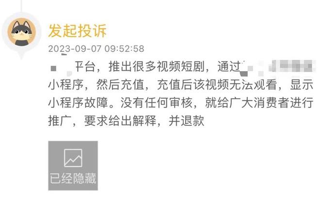 在消费者投诉平台黑猫投诉上,有不少网友反映称,在小程序上看微短剧遭遇虚假宣传却投诉无门。广东网友刘女士说,她是在一个短视频平台点击了相关链接,跳转到另一社交平台充值后发现被欺骗。